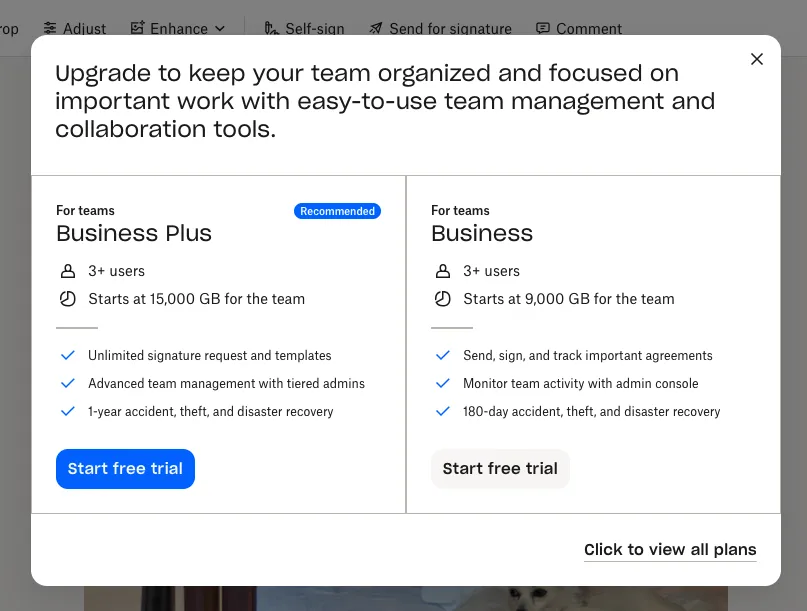 But then at some point, I started getting increasingly obnoxious upsell messages whenever I was using the Dropbox website. It started with a small but persistent button in the toolbar asking me to upgrade. Then the button became visually louder and started showing up in bright colors made to draw attention. And finally, I started getting pop-ups every single day to upgrade to the team plan. Here’s a screenshot.